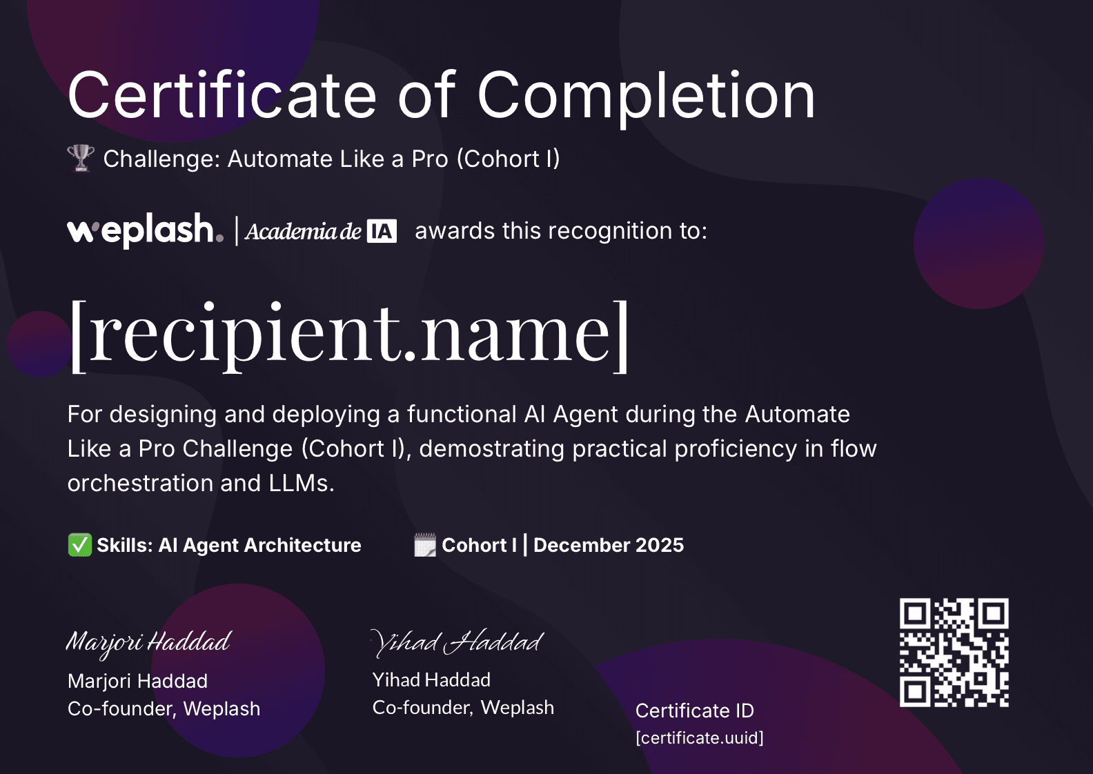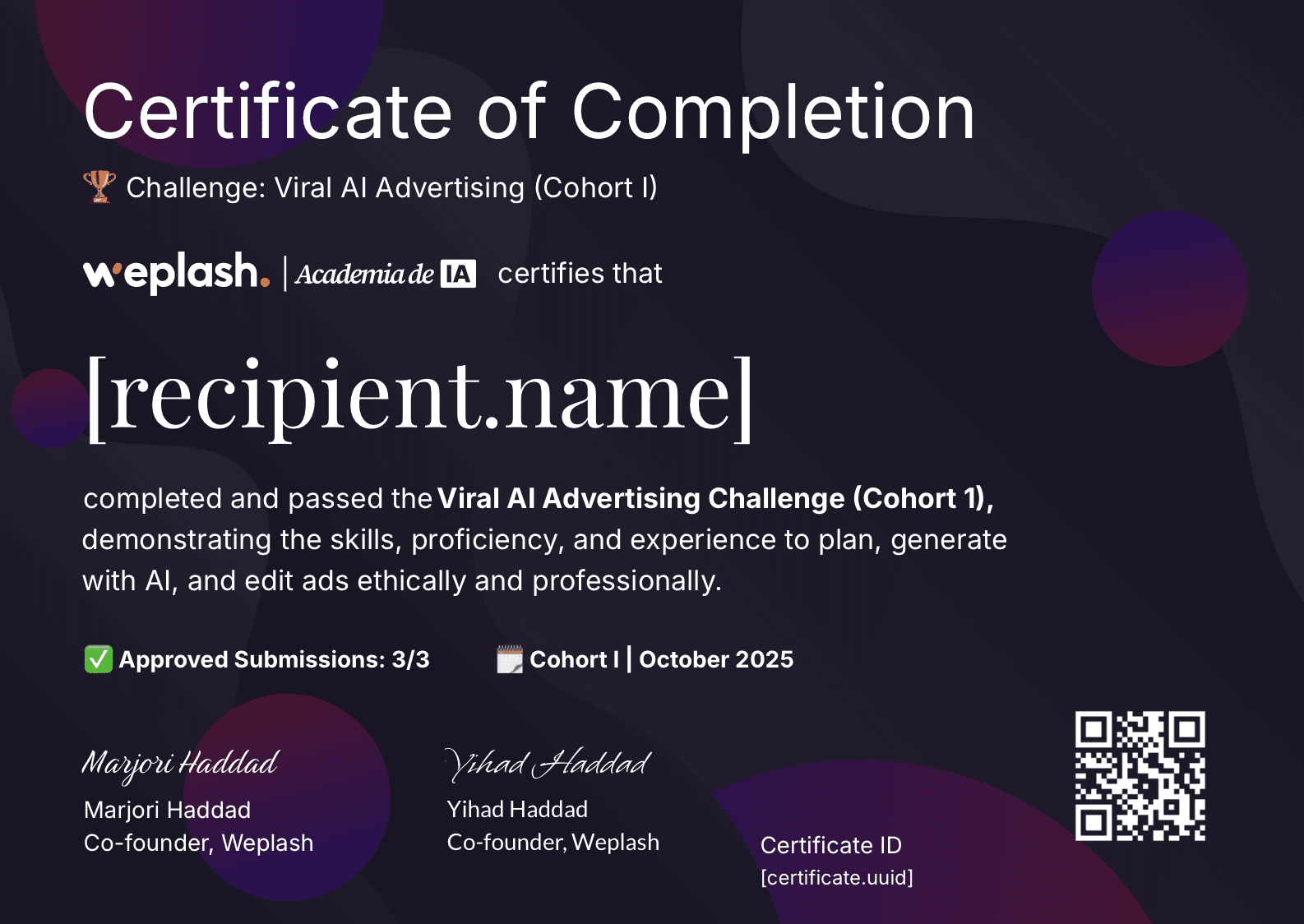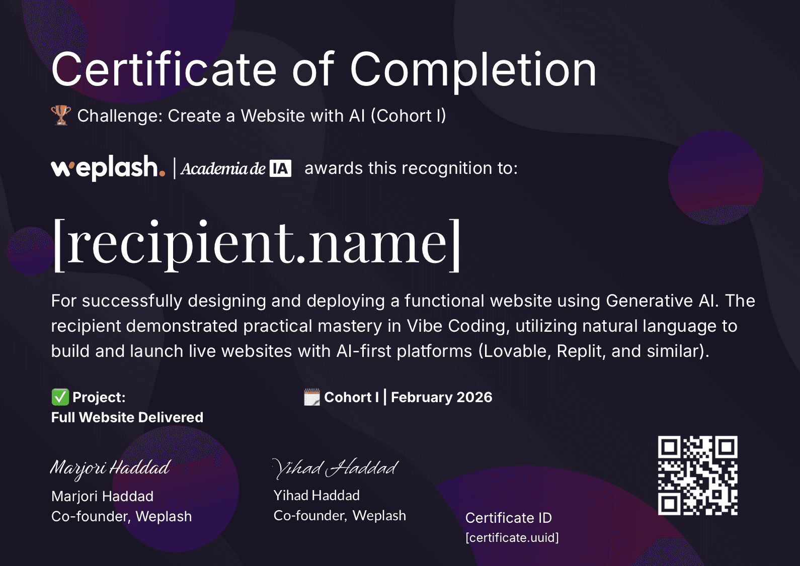 Todos los participantes que completen el reto con éxito recibirán su certificado oficial. Además, las mejores entregas obtendrán recompensas monetarias y visibilidad en las redes de Weplash, destacando su trabajo frente a toda la comunidad. Sí, te pagaremos por aprender 😉.